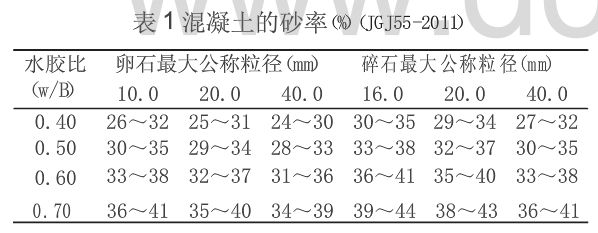 JGJ55-2011《普通混凝土配合比设计规程》中,当已知混凝土的水胶比与石子的最大公称粒径,可由表1查得合理砂率。